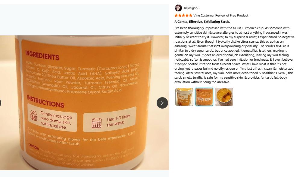 Water, Sucrose, Glycerin, Sugar, Turmeric (Curcuma Longa) Extract,Vitamin C, Kojic Acid, lactic Acid(AHA),Salicylic Acid (BHA)Polysorbate 20, Shea Butter Oil, Ascorbic Acid, Evening Primrose Oil.Organic Turmeric Root Powder, Turmeric Essential Oil, PerseaGratissima(Avocado)oil, Coconut oil, Citrus Oil, Niacinamide, Collagen, Phenoxyethanol, Propylene Glycol, Sorbic Acid.