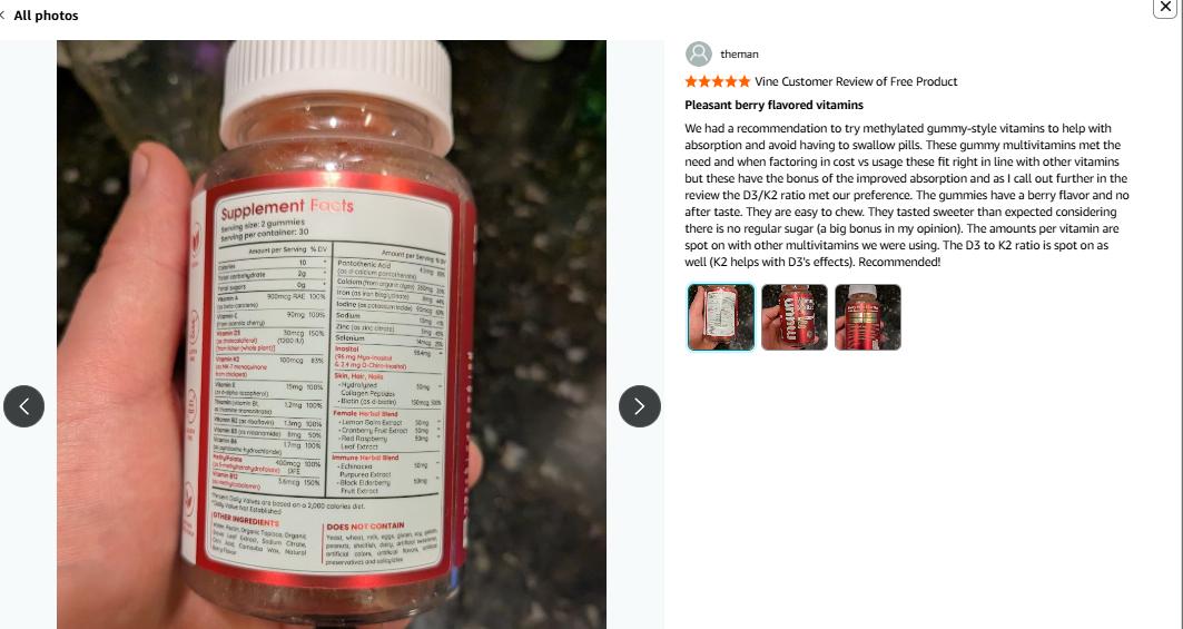 We had a recommendation to try methylated gummy-style vitamins to help with absorption and avoid having to swallow pills. These gummy multivitamins met the need and when factoring in cost vs usage these fit right in line with other vitamins but these have the bonus of the improved absorption and as I call out further in the review the D3/K2 ratio met our preference. The gummies have a berry flavor and no after taste. They are easy to chew. They tasted sweeter than expected considering there is no regular sugar (a big bonus in my opinion). The amounts per vitamin are spot on with other multivitamins we were using. The D3 to K2 ratio is spot on as well (K2 helps with D3's effects). Recommended!